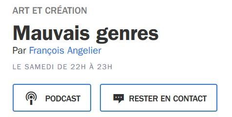 Sur France culture, le samedi à partir de 22h > 0h, François Angeliernous convie à fréquenter la littérature de genre qui n'a pas beaucoup de place dans les médias...(fantastique, SF, érotique, étrange, etc.) Souvent un régal de connaissances et de drôlerie... Le genre policier et la littérature noire y trouvent écho naturellement. Podcast de l'émission